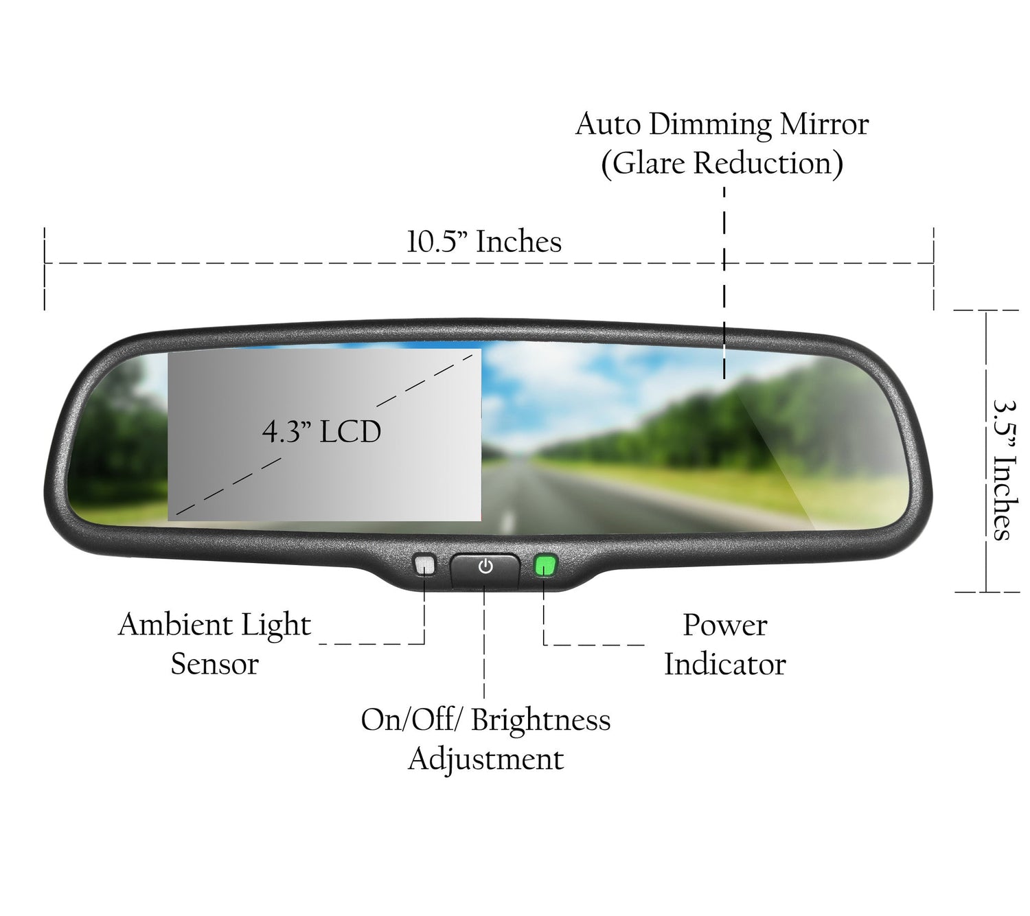 The OEM replacement aftermarket 4.3" LCD Rear View Mirror fully replaces your current rear view mirror. It has a LCD display sensor that will automatically adjust the LCD's brightness to the ambient light. On bright days, the screen will be brighter and at night, the screen will be dimmer. The OEM style gives you a sleek and original look fully complimenting your vehicles interior. The unit requires a 12V power source to power the unit. With TWO video inputs, you are able to display 2 different types of images.